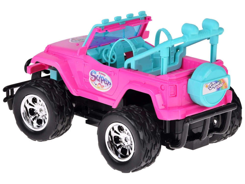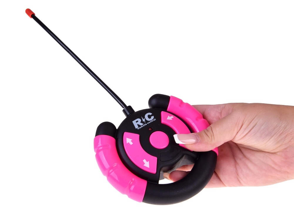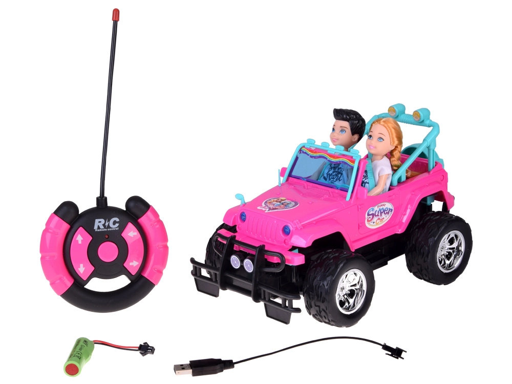 Zábavná sada pre malé vodičky aj vodičov: ružové RC terénne auto s veľkými kolesami a dvoma figúrkami (dievča a chlapec). Auto má svietiace predné svetlá, gumové pneumatiky pre dobrú priľnavosť, nastaviteľné bezpečnostné pásy na sedadlách a ovládanie v 4 smeroch pomocou ružového ovládača. Súčasťou je nabíjací akumulátor 3,7 V s USB nabíjaním.