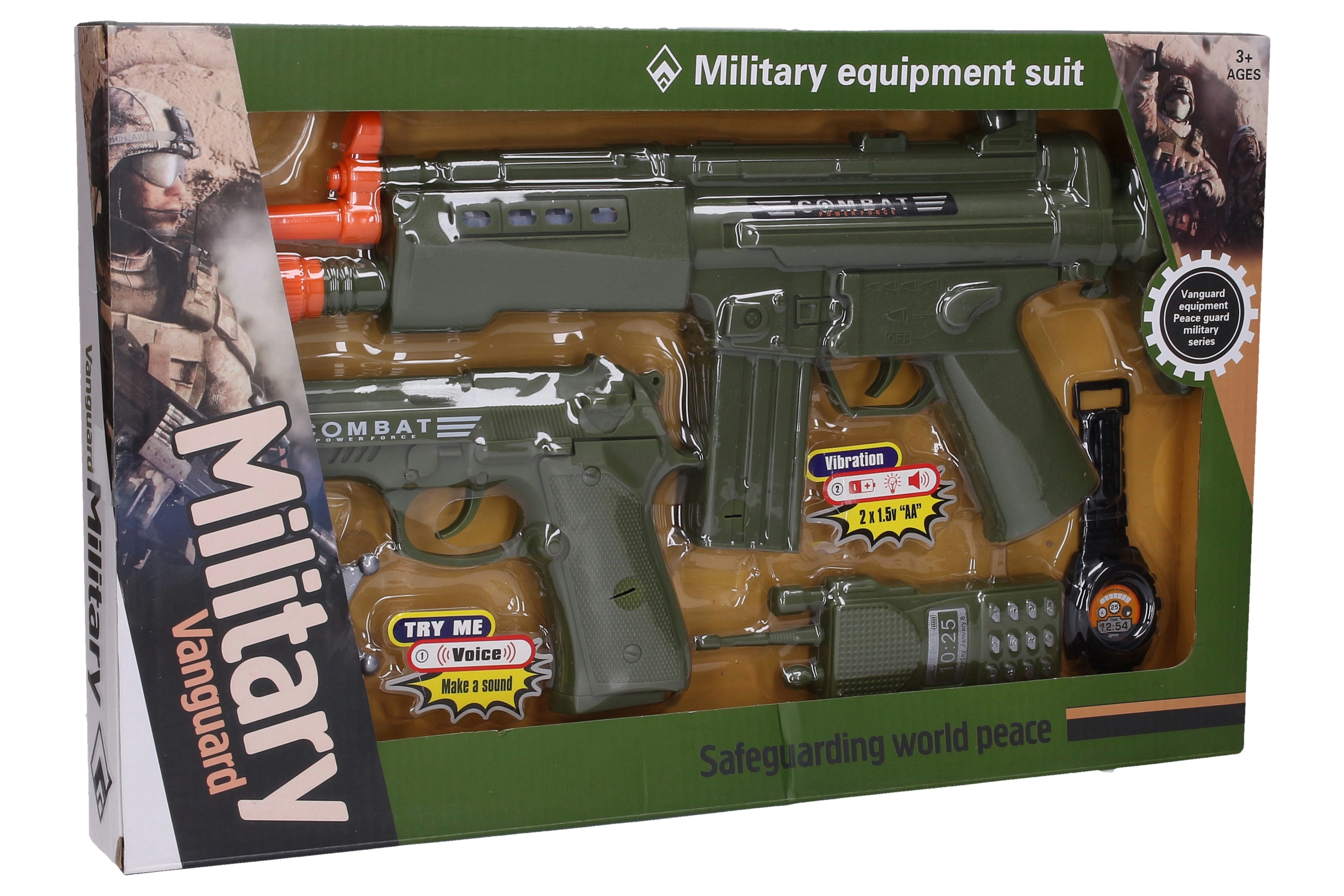 Kompletný vojenský set pre malých dobrodruhov obsahuje samopal, pištoľ, odznak, vysielačku a hodinky. Hračka vydáva svetelné a zvukové efekty, ktoré umocnia zážitok z hry. Samopal je napájaný 2× AA batériami (súčasť balenia), takže sa deti môžu začať hrať ihneď.