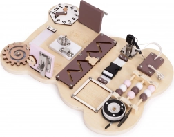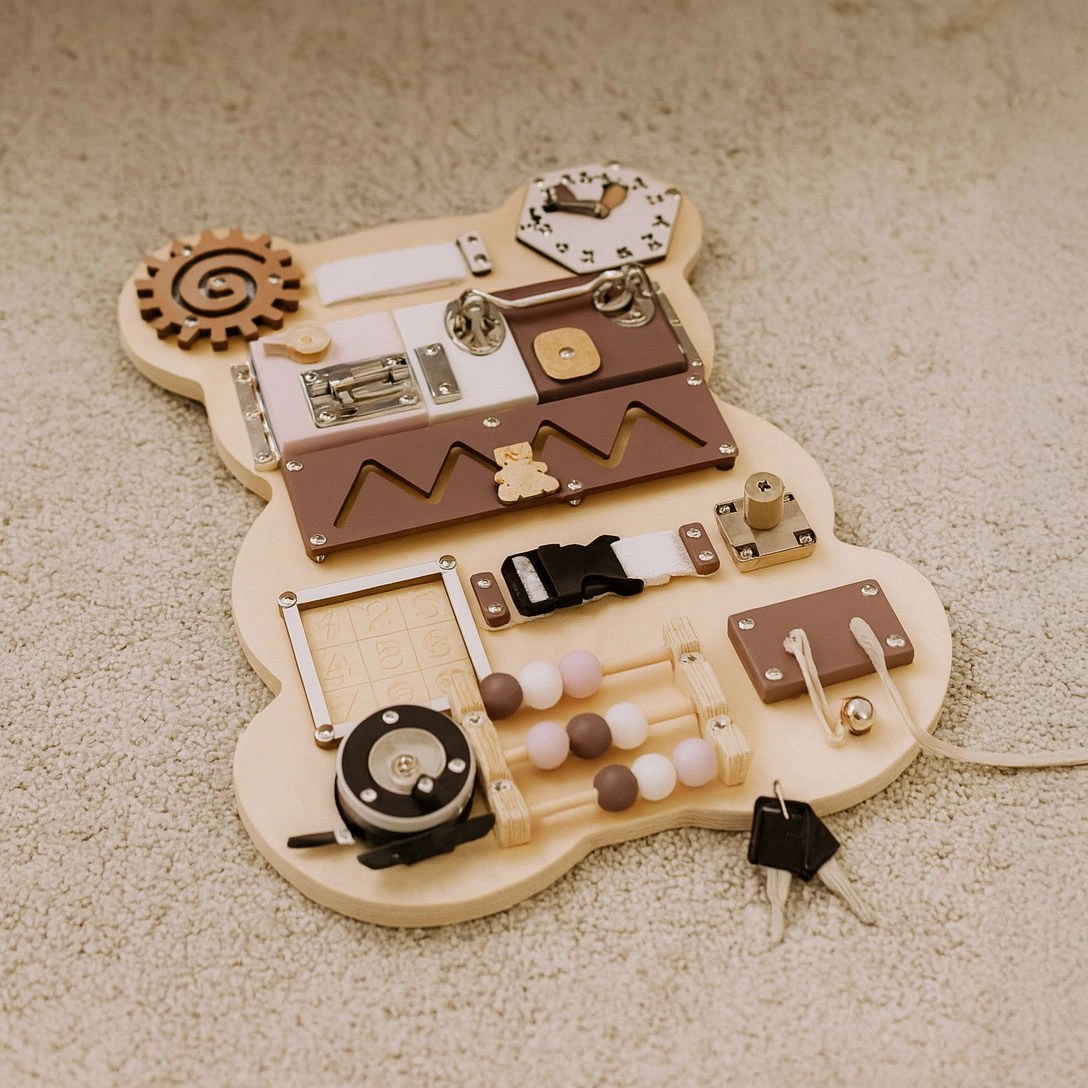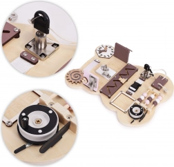 Busy board podporuje zmyslovú stimuláciu a bezpečné experimentovanie s mechanizmami známymi z každodenného života. Deti si hravou formou precvičia počítanie na guľôčkovom počítadle, pochopia princípy príčina–následok a osvoja si praktické zručnosti, ktoré využijú aj mimo hry.