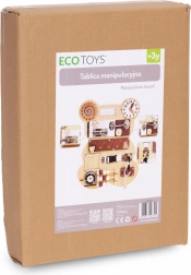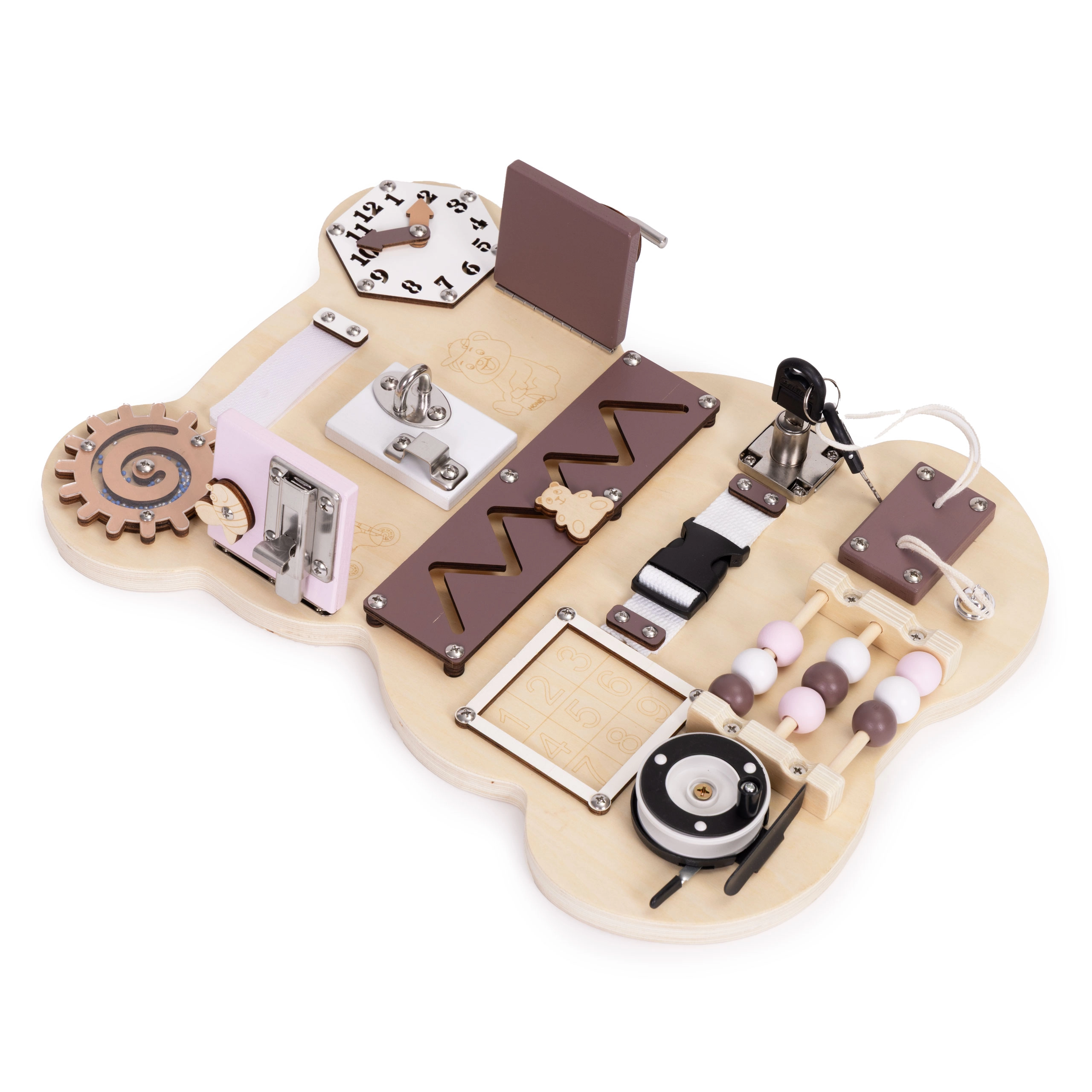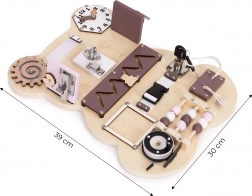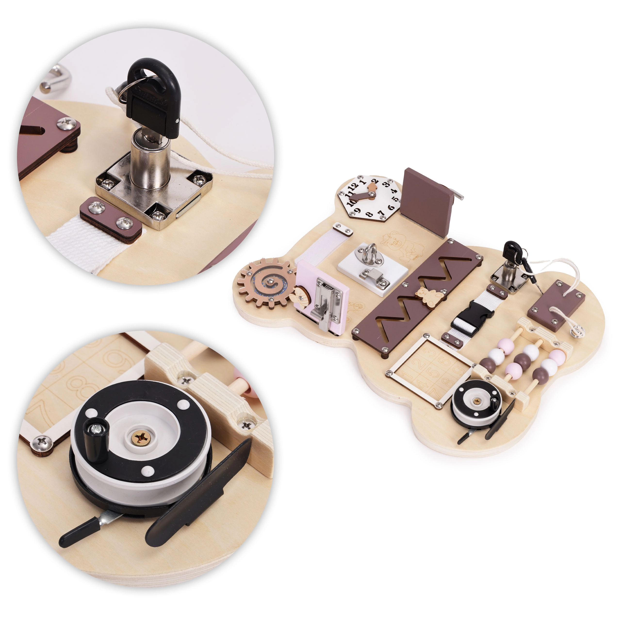 Drevená aktívna doska ECOTOYS v tvare medvedíka je premyslená vzdelávacia hračka pre deti od 3 rokov. Vďaka kombinácii dreva, kovu a textilných prvkov deti trénujú úchop, koordináciu oko–ruka aj trpezlivosť. Bohatá škála prvkov – od zámku s kľúčom cez ozubené kolieska až po pohyblivé hodiny – prirodzene vedie k objavovaniu a rozvíja samostatnosť.