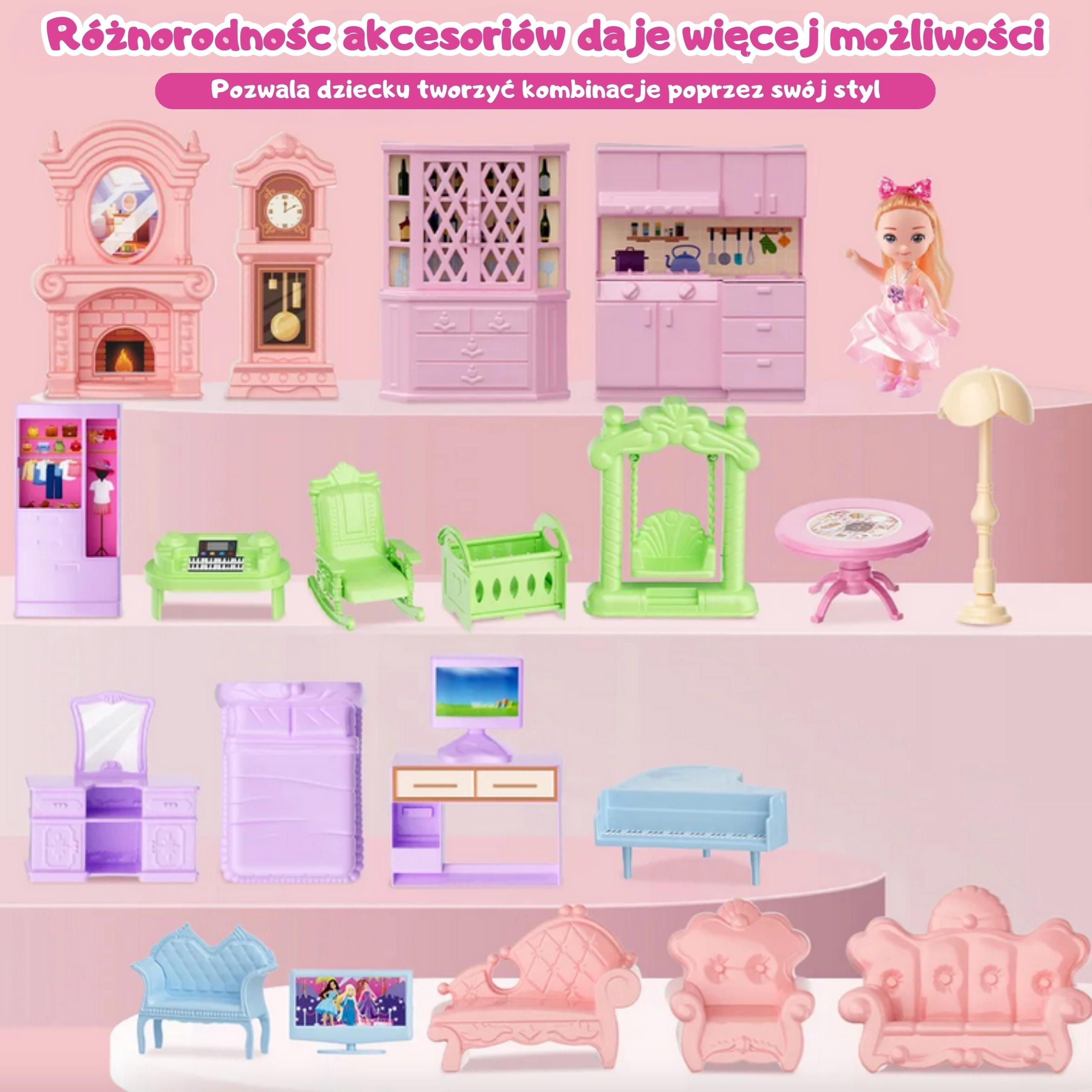 Domček pre bábiky Woopie Záhradná vila prináša deťom rozprávkovú atmosféru a nekonečné možnosti hry. Dve poschodia, šesť premyslených miestností, terasa a dekoratívne prvky tvoria pôvabný „zámeček“, ktorý vďaka svietiacim vežičkám doslova zažiari. Pastelová kombinácia ružovej, fialovej a mentolovej farby vytvára prívetivé prostredie pre samostatnú aj spoločnú hru.