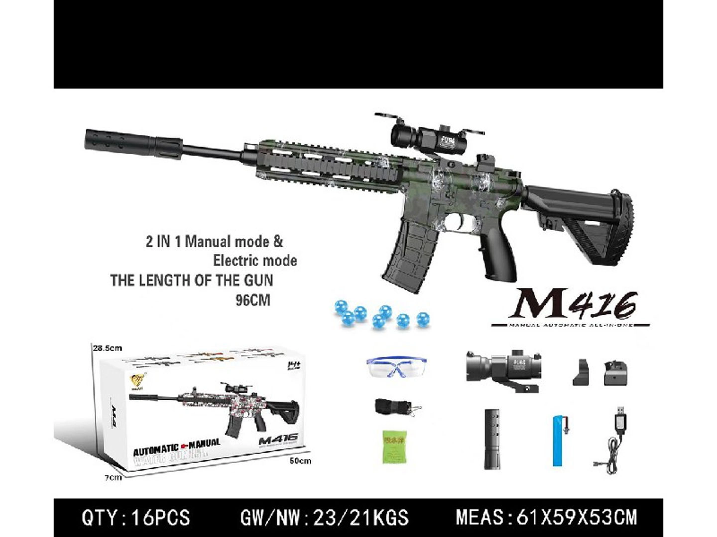 Puška M416, zásobník, tlmič, zameriavač, USB kábel, akumulátor 7,4 V, vrecko s guličkami (cca 500 ks) na prípravu, popruh, ochranné okuliare, návod