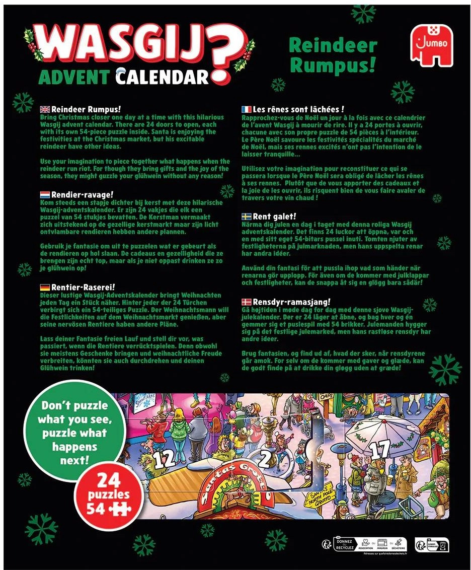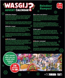 Objavte čaro Vianoc s originálnym adventným kalendárom WASGIJ od značky Jumbo. Každý deň na vás čaká nové mini puzzle s prekvapivým motívom – to, čo skladáte, nie je obrázok na krabici! Užite si 24 rôznych puzzle, každé o 54 dielikoch, s rozmerom cca 16,5 × 11,5 cm. Skvelá zábava pre všetkých, ktorí milujú výzvy a netradičné skladanie.