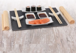 Misky na omáčky, tácky a odpočívadlá na paličky umožnia čisté a estetické podávanie, kamenná doska zvýrazní vzhľad vašich sushi roliek.