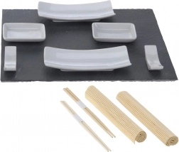 Vďaka premyslenému zloženiu prvkov ľahko pripravíte hostinu pre dvoch: pohodlné paličky s odpočívadlami, misky na omáčky, kompaktné podložky na rolovanie aj kamennú dosku na servírovanie sushi a sashimi. Súprava je ideálna na každodenné používanie, oslavy aj večery v štýle Japonska.