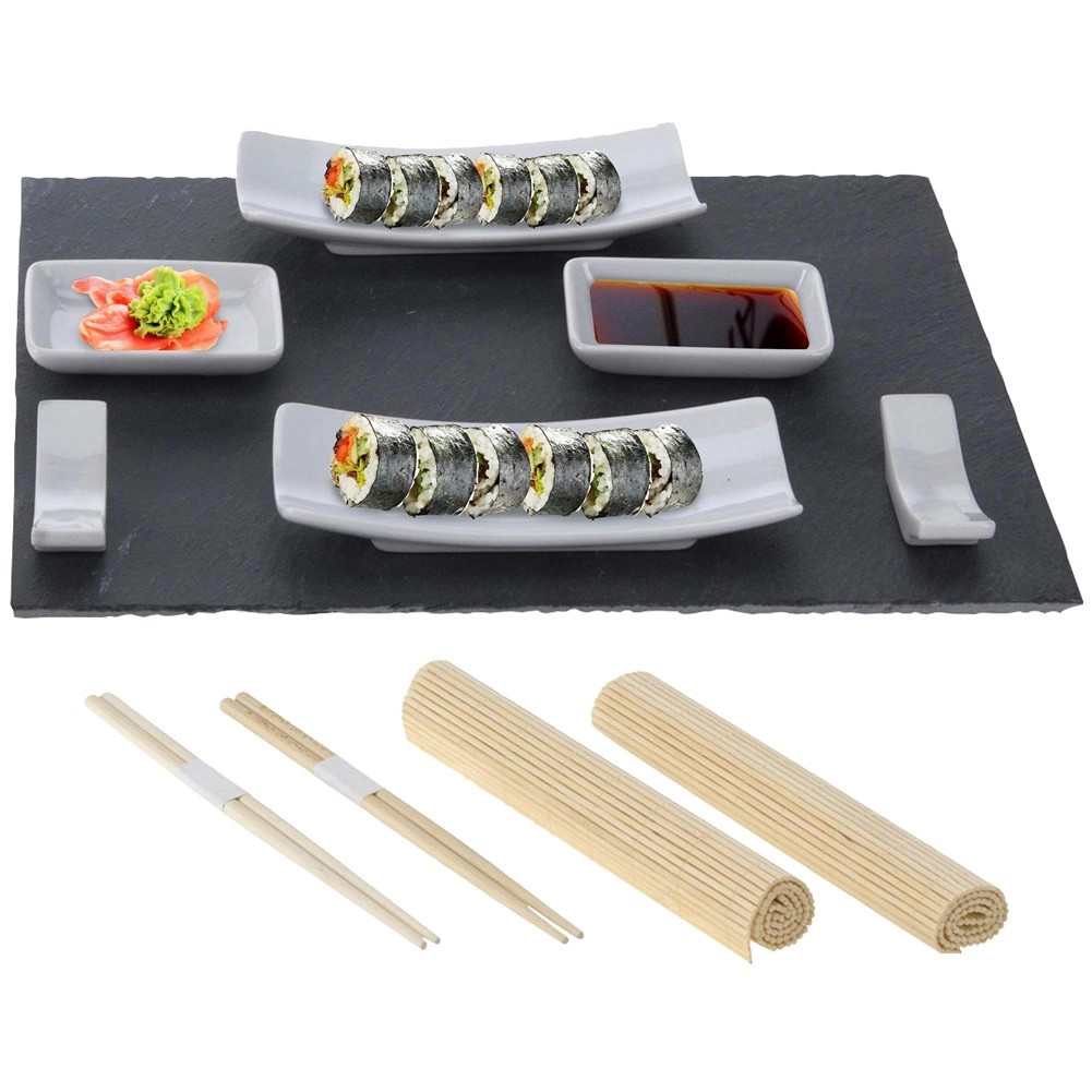 Štýlová súprava na sushi pre dvoch kombinuje porcelán, bambus a kamennú servisnú dosku pre dokonalé domáce servírovanie. Obsahuje všetko potrebné na elegantnú prezentáciu aj pohodlné stolovanie, je odolná, praktická na každý deň aj slávnostné príležitosti a predstavuje skvelý tip na darček pre milovníkov japonskej kuchyne.