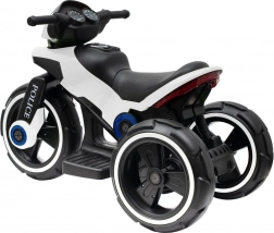 Štýlová detská elektrická motorka BABY MIX POLICE v bielej farbe ponúkne bezpečnú a stabilnú jazdu vďaka širokým kolesám, pohodlnému sedadlu a pohonu oboch zadných kolies. Dva motory 6V/24W zabezpečujú plynulý rozjazd, jazdu vpred aj vzad ovládate prepínačom a brzdenie prebieha uvoľnením pedála. Nechýbajú LED svetlá, zvukové efekty a prehrávanie hudby cez USB/MP3 – ideálna voľba pre malých policajtov od 3 do 7 rokov.