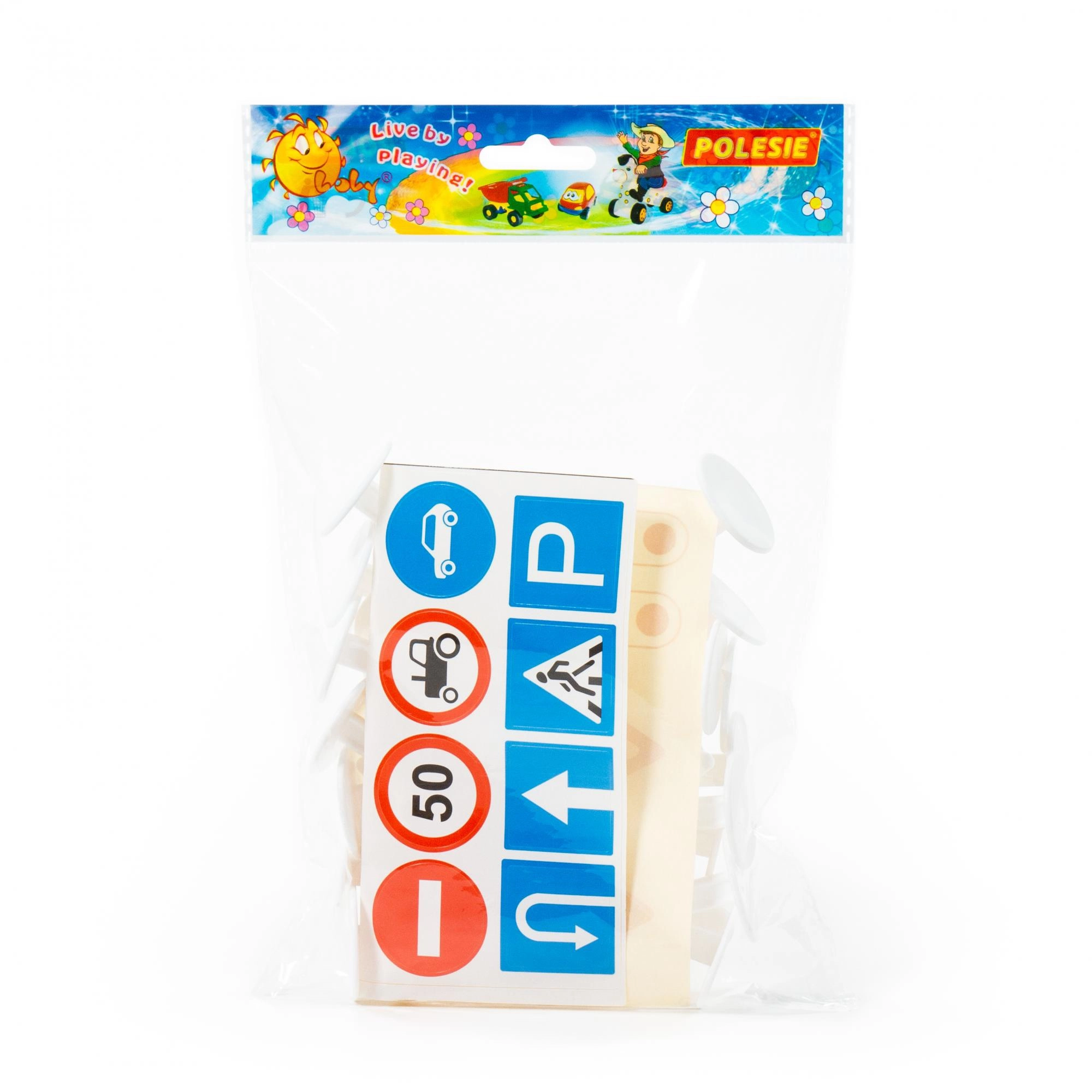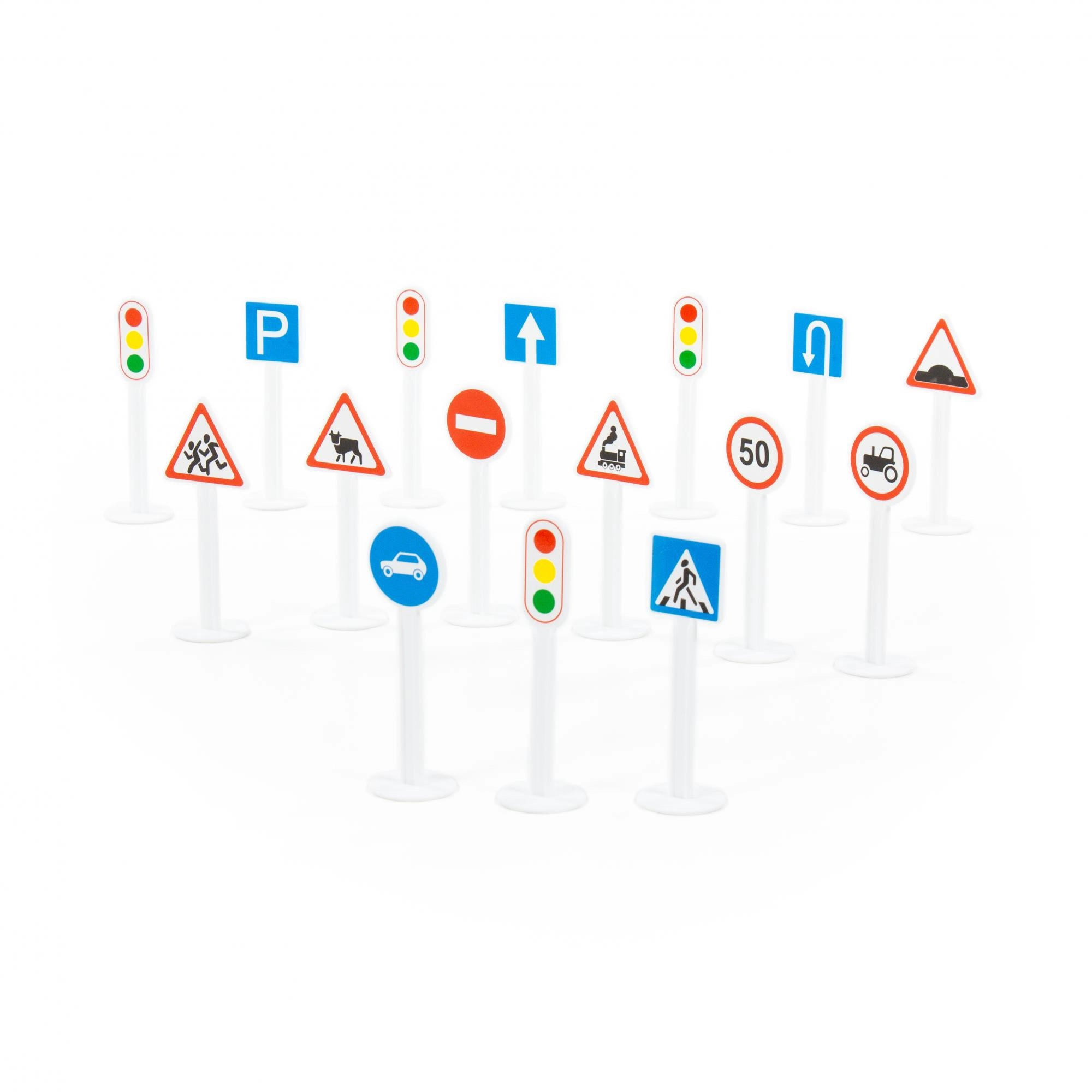 Obsahuje široký výber symbolov – rýchlosť, zákaz vjazdu, parkovanie, semafor, smerové šípky a ďalšie. Ideálne na modelové dopravné situácie.