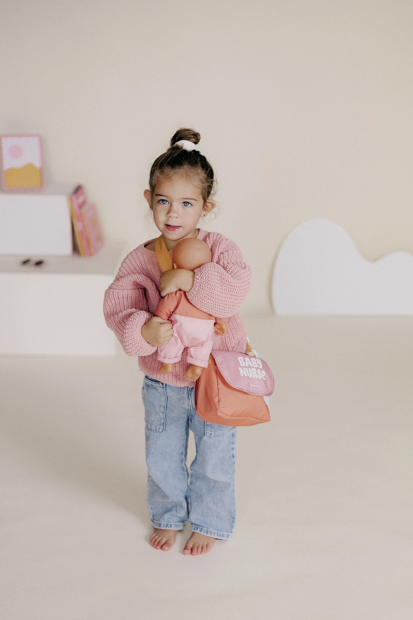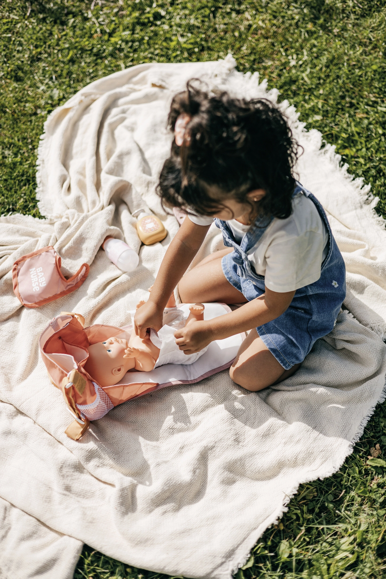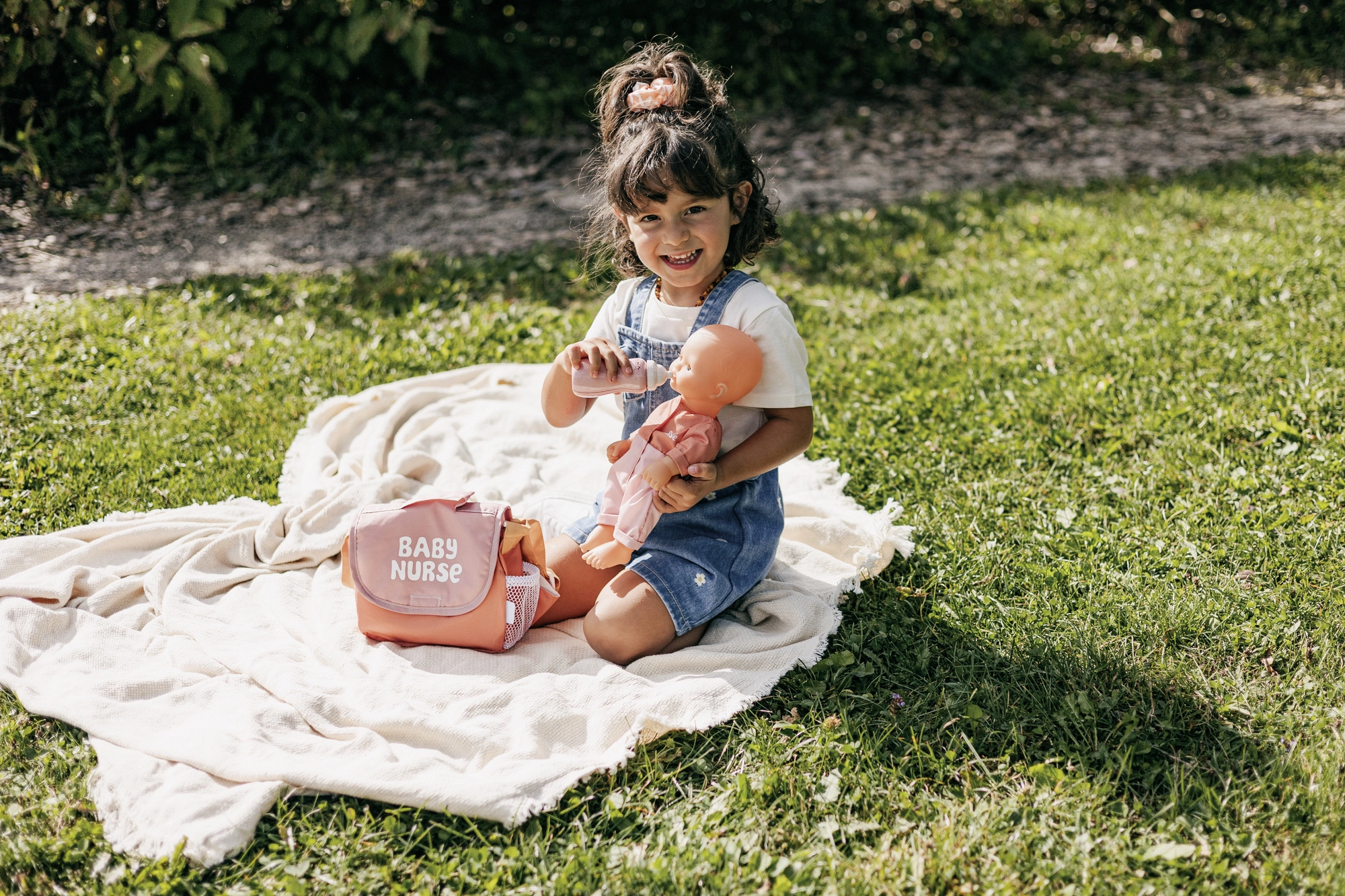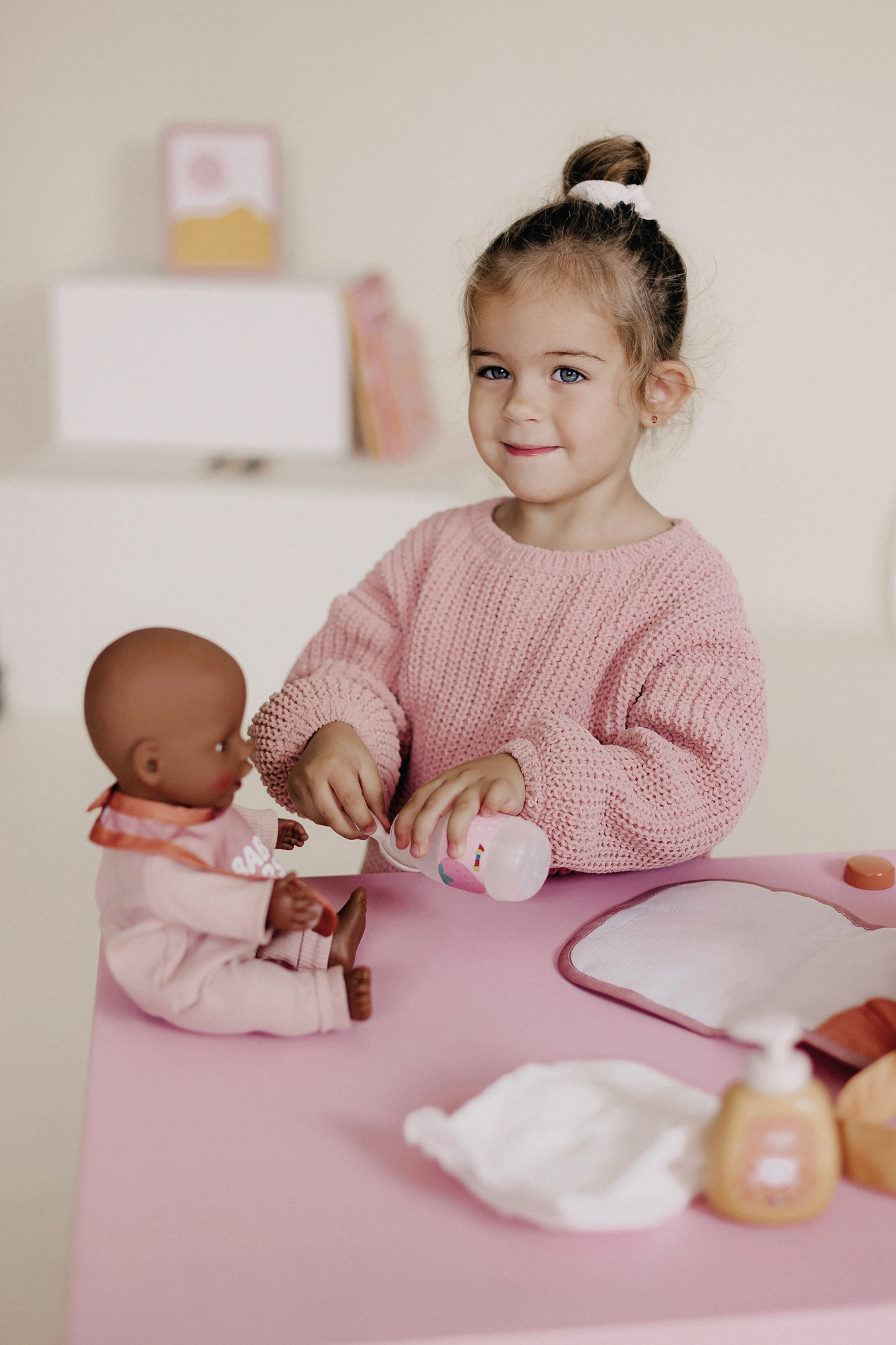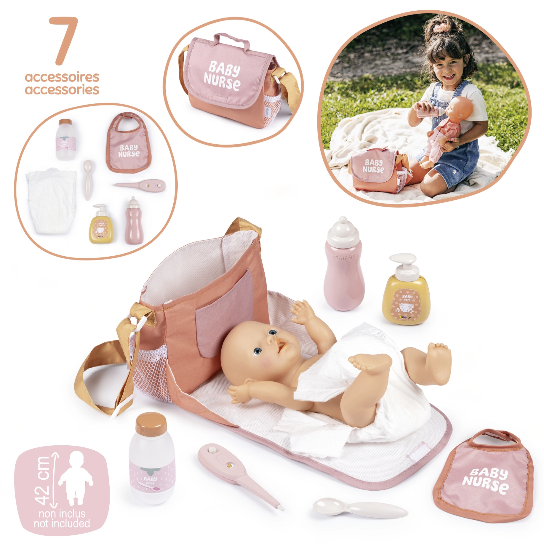 Súčasťou je všetko na každodenné hranie a napodobňovanie skutočnej starostlivosti: fľaštička na mlieko, teplomer, sirup s lyžičkou, dávkovač na šampón, podbradník a plienka pre bábiku. Set rozvíja kreativitu, jemnú motoriku a učí zodpovednosti a nežnej starostlivosti.