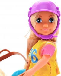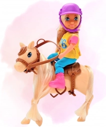 - bábika jazdkyňa, ochranná helma, figúrka koňa so svetlou hrivou a chvostom, sedlo a uzdička