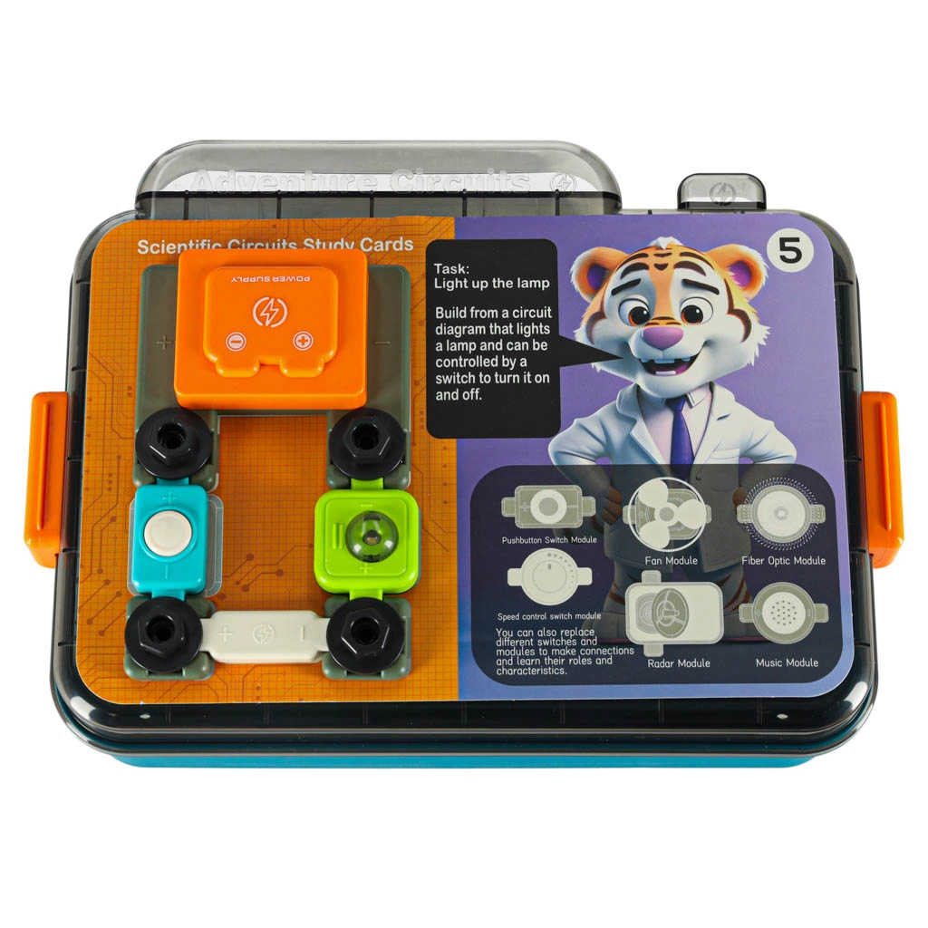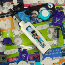 box s vekom, napájacia stanica na batérie, modul spínača, svietiaci kľúč obvodu, modul s otočným ovládačom, radarový modul, svetelný modul, hudobný modul, modul ventilátora, svetlovodný modul, 12 kariet úloh, elektrický skrutkovač, 12 štvorcestných modulov, 12 skrutiek, 10 obvodových modulov, návod