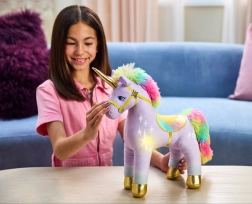 Plyšový jednorožec WILDSTAR je inšpirovaný obľúbeným seriálom UNICORN ACADEMY. Je vyrobený z hebkého lila plyšu so svetlými „magickými“ motívmi, má trblietavý zlatý roh a kopytá, dúhovú hrivu aj chvost a elegantný postroj. Po dotyku čela sa rozsvieti roh aj dekoratívne prvky na tele teplým LED svetlom a zaznie magický zvuk.