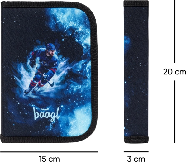 Praktický jednoposchodový peračník Baagl s motívom hokeja ponúka prehľadné usporiadanie, odolný zips YKK a priestranný vnútro s vreckom a okienkom na rozvrh. Je vyrobený z recyklovaného materiálu a vďaka pevným gumičkám bezpečne udrží aj trojhranné pastelky a fixky.