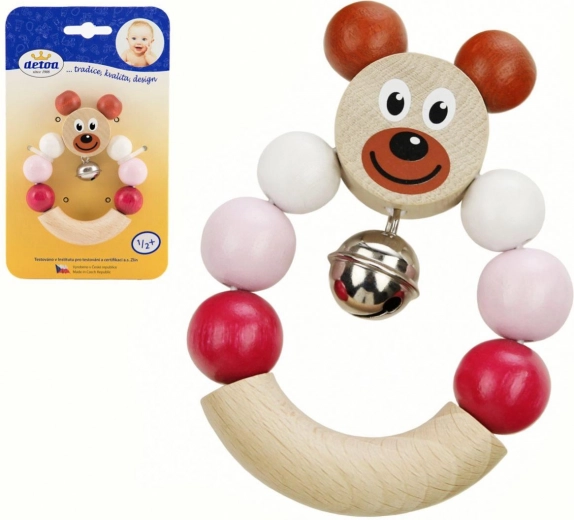Roztomilá drevená hrkálka s medvedíkom v ružovej farbe poteší každé bábätko. Integrovaná rolnička jemne cinká, hrkálka je ľahučká a vďaka kompaktným rozmerom 7 × 9 cm sa skvele drží v malých rúčkach. Výrobok spĺňa prísne požiadavky EÚ na bezpečnosť hračiek a pýši sa certifikátom Bezpečné hračky.