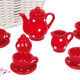 Pripravte sa na fantastický piknik s našim detským čajovým setom. Tento očarujúci set obsahuje všetko, čo potrebujete – od kanvice, šálok, tanierikov až po nádobky na mlieko a cukor, všetko vyrobené z odolnej keramiky s veselým červeným a bielym bodkovaným dizajnom. Všetkých 17 dielov je starostlivo uložených v elegantnom prútenom koši s látkovými obrúskami.