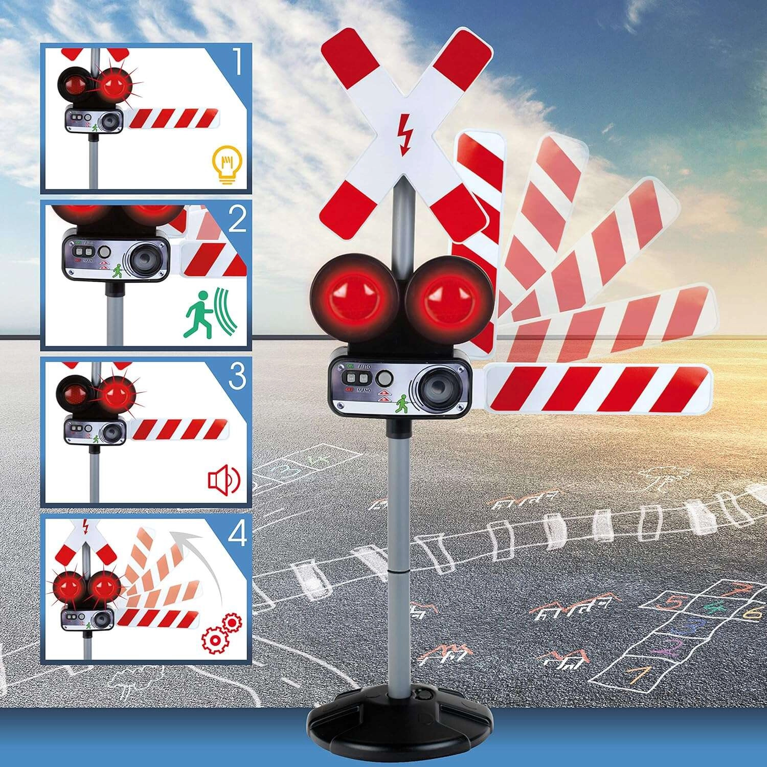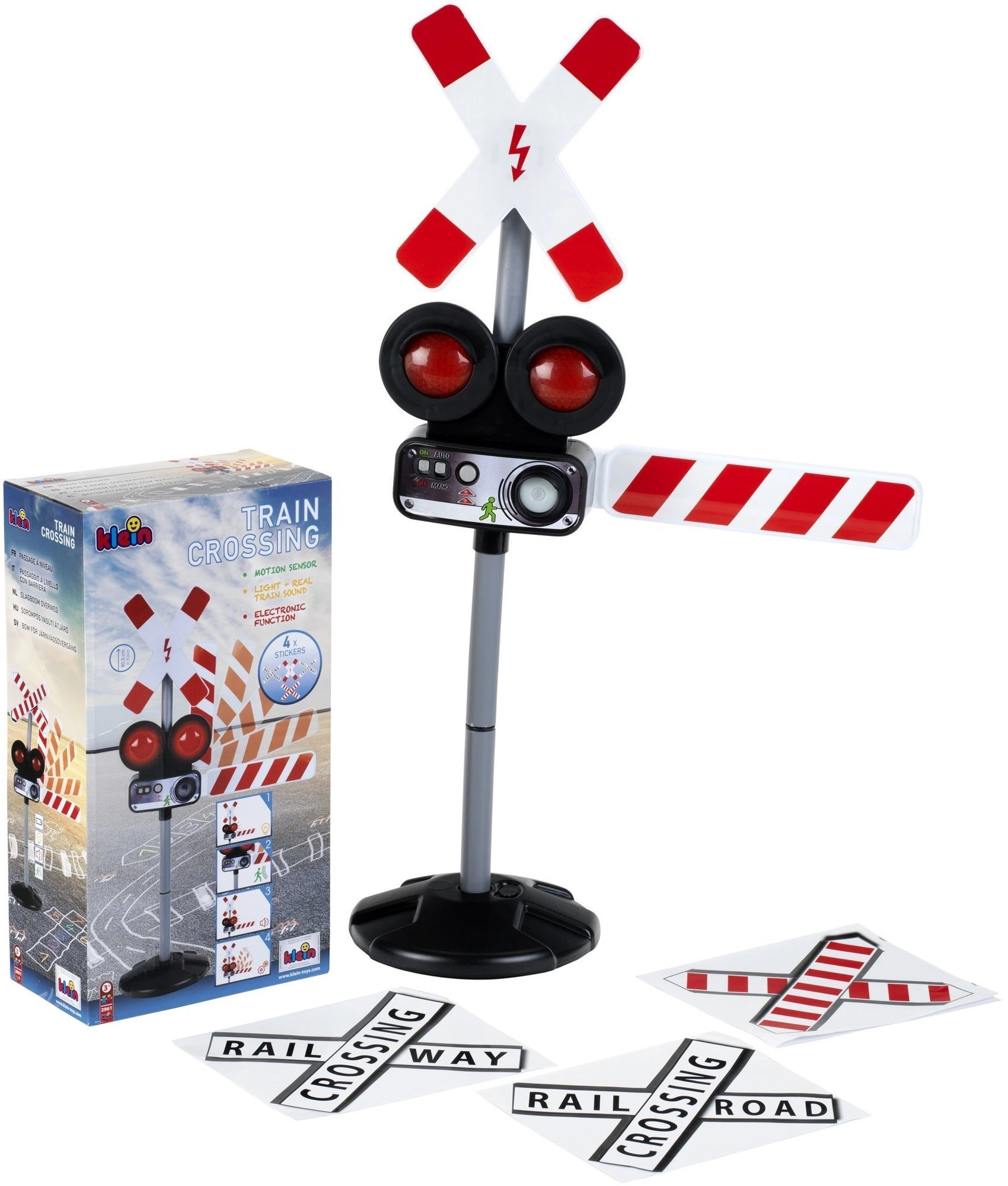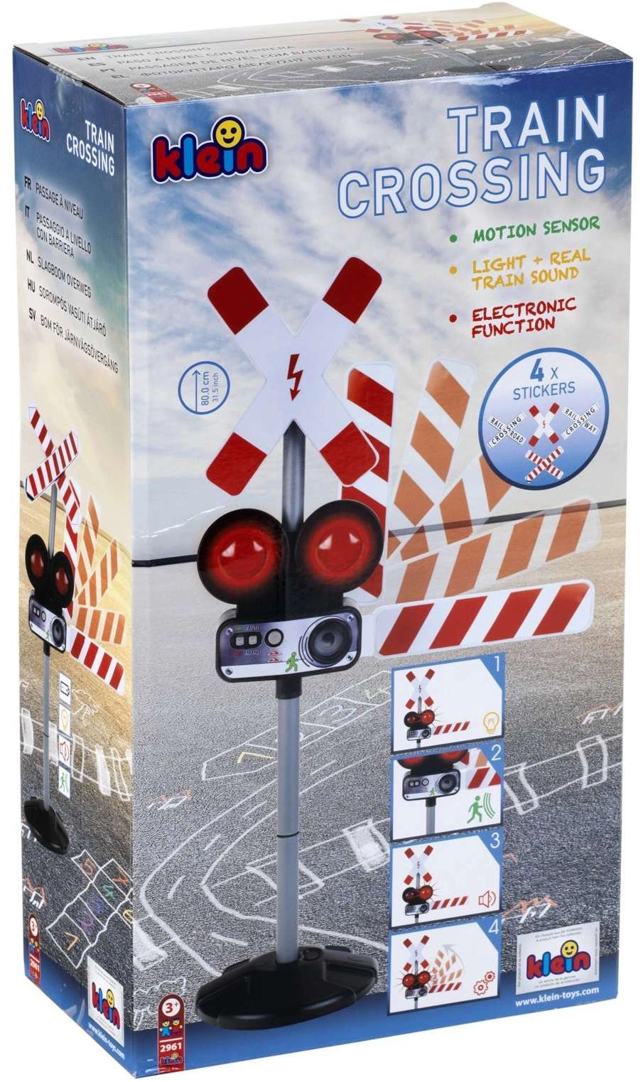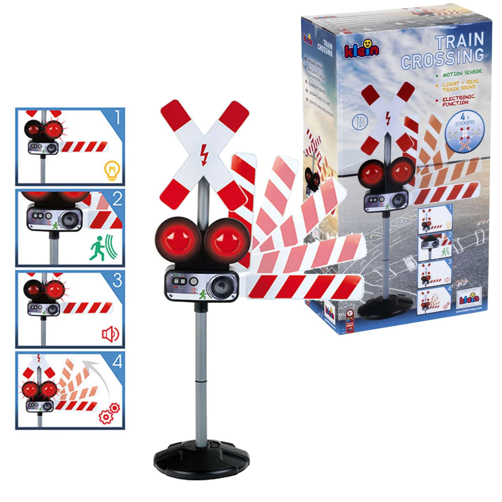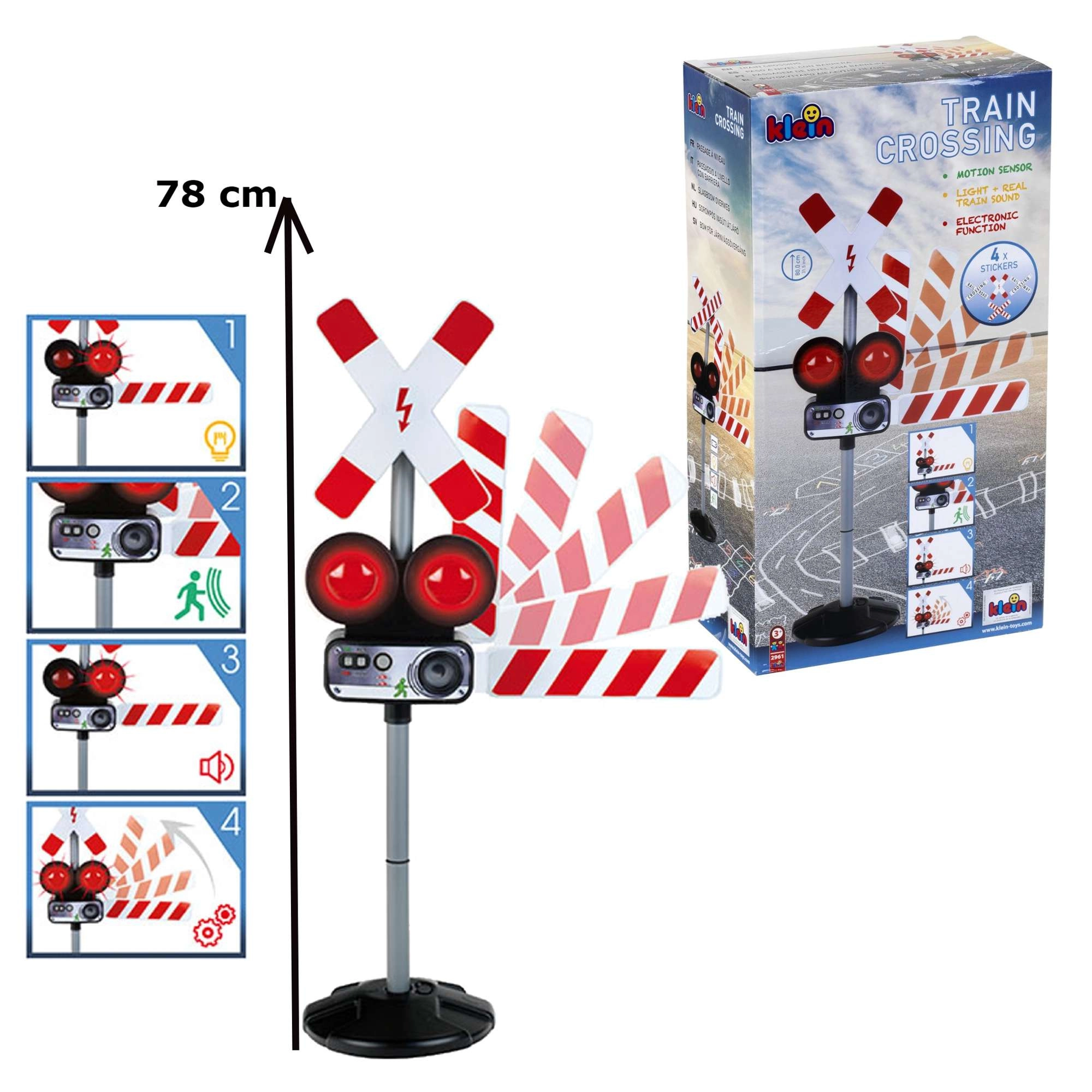 Interaktívna dopravná značka od značky KLEIN realisticky simuluje železničný priechod – so svetelnou signalizáciou, zvukmi vlaku a pohyblivým ramenom. Vďaka manuálnemu ovládaniu aj pohybovému senzoru ponúka zábavnú a edukačnú hru, ktorá učí bezpečnému správaniu v doprave. Ideálne pre deti od 3 rokov.