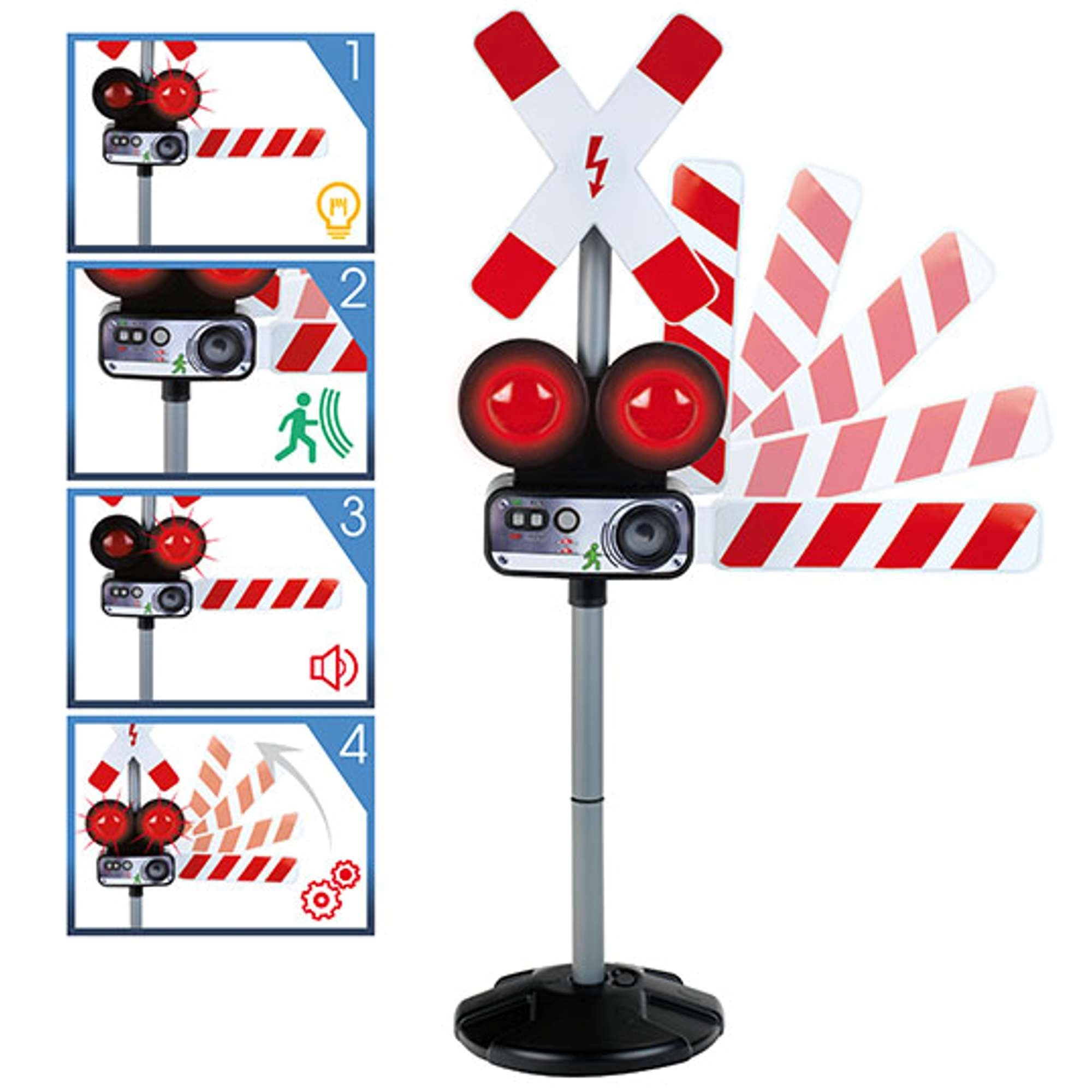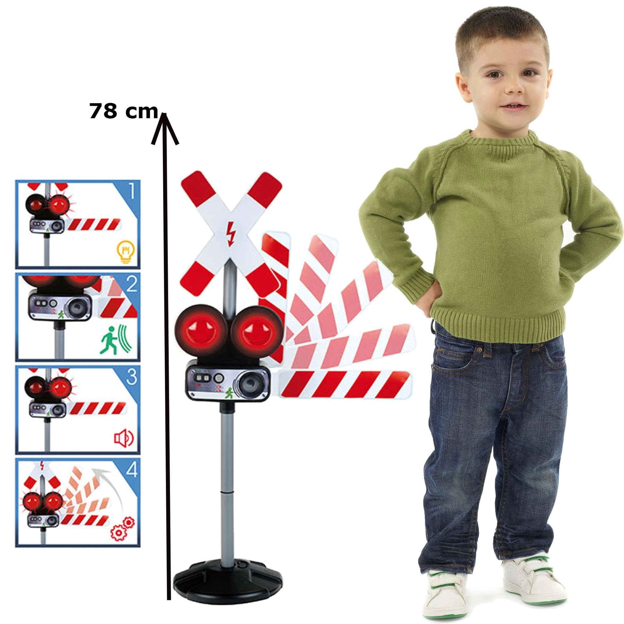 Dve červené blikajúce svetlá a autentické zvuky vlaku vytvárajú skutočnú atmosféru železničného priechodu, ktorá deti okamžite vtiahne do hry.