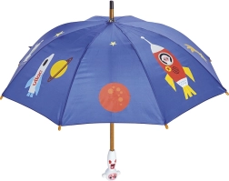 Objavte čaro daždivých dní s detským dáždnikom VILAC Kozmonaut. Farebná vesmírna potlač s planétami a raketami premení cestu do škôlky či školy na zábavu, zatiaľ čo robustná konštrukcia spoľahlivo ochráni pred dažďom. Ergonomická drevená rukoväť sa deťom dobre drží a podporuje istý úchop.