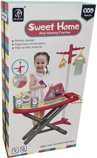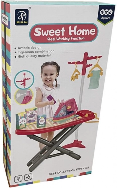 Plastová žehliaca doska so žehličkou, vešiakom, ramienkami a ďalším príslušenstvom pre malé gazdinky. Výška dosky 50 cm. Žehlička má zvukové a svetelné efekty.