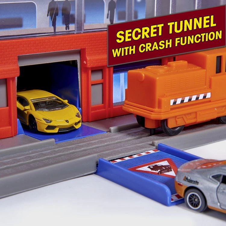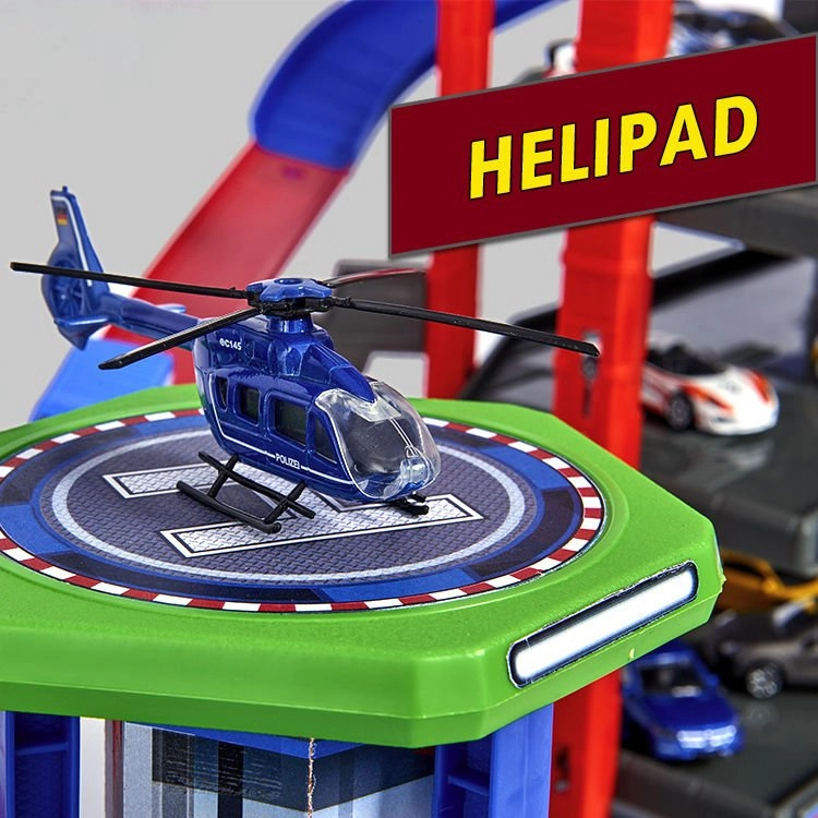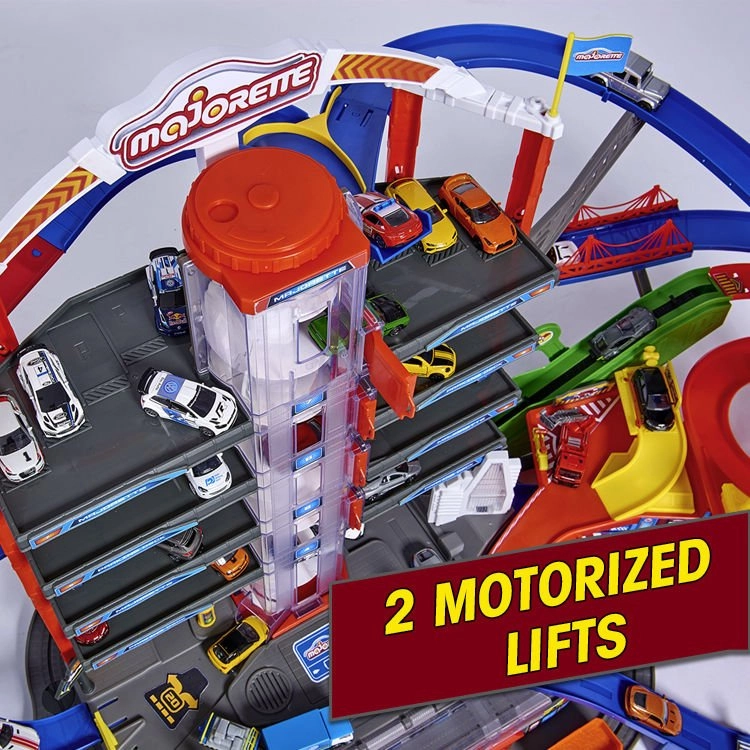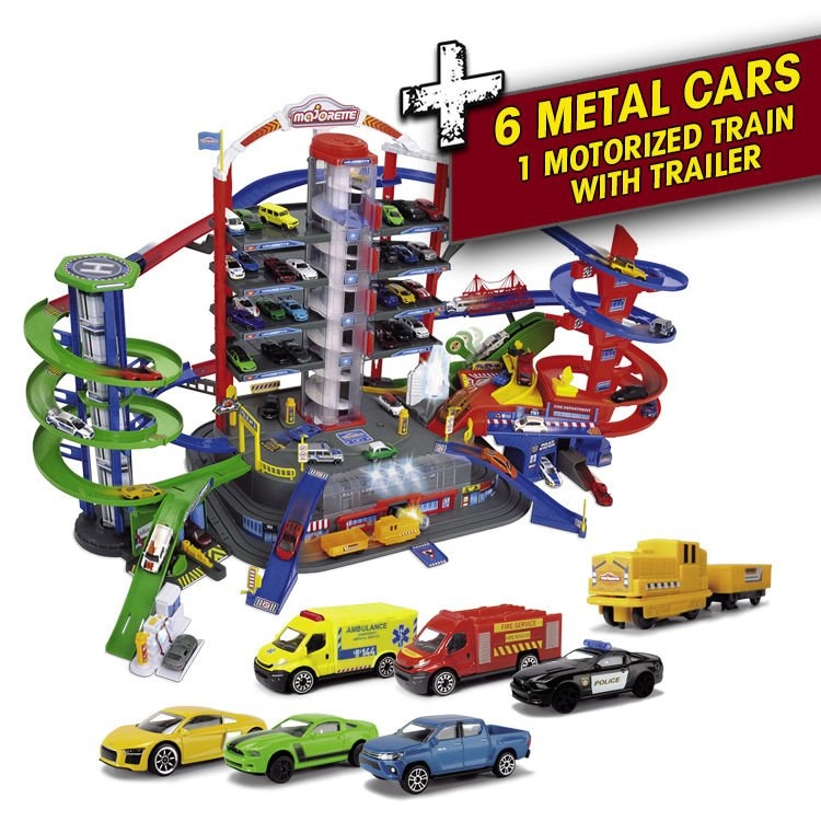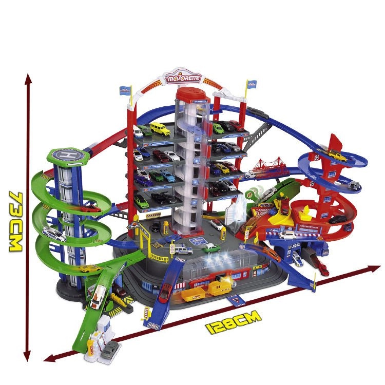 Tento veľký garážový set prináša deťom nekonečné možnosti hry na ploche siedmich poschodí. Farebné špirálové dráhy, batériou poháňaný výťah a realistické svetelné a zvukové efekty vtiahnu do deja každého malého nadšenca áut a vlakov. Kovové autíčka s voľne sa otáčajúcimi kolieskami jazdia hladko po rampách, zatiaľ čo lokomotíva s vagónom prechádza tajným tunelom a zastavuje na vlakovej stanici.