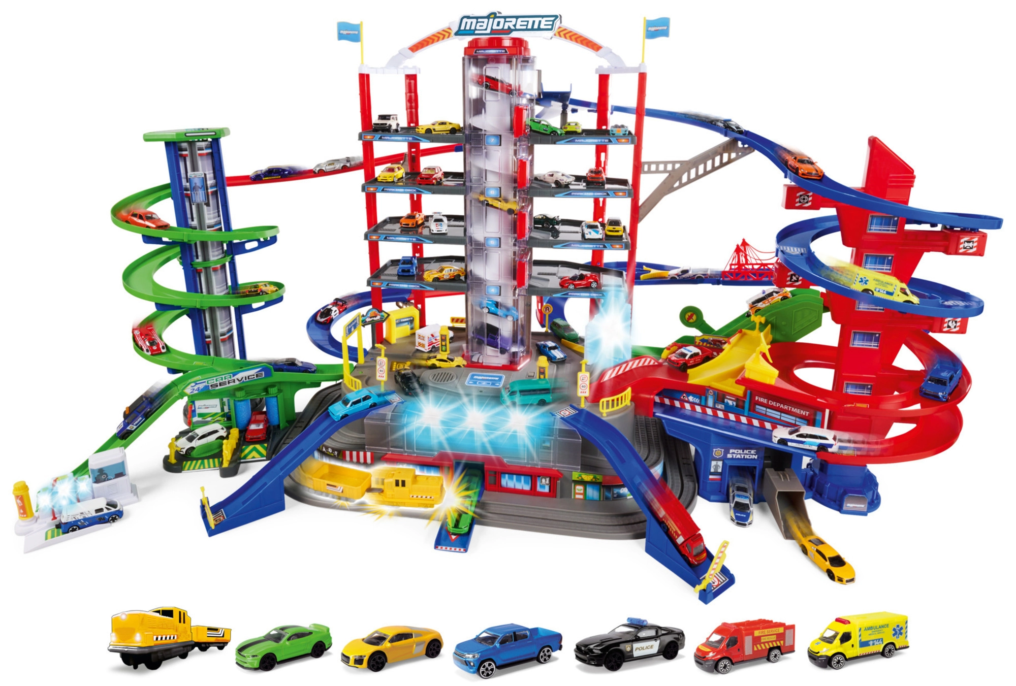 Objavte megaset pre malých vodičov: 7-poschodový garážový komplex Super City s výťahom, špirálovými rampami a 6 kovovými autíčkami doplnenými o lokomotívu so svetelnými a zvukovými efektmi. Nechýba heliport, stanica polície a hasičov, umývačka ani čerpacia stanica so zvukmi a svetlami – všetko pre maximálnu porciu akčnej a kreatívnej hry.