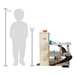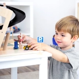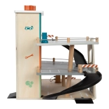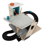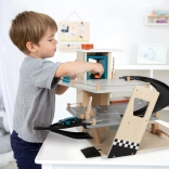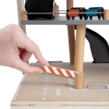 Toto dizajnové drevené pretekárske parkovisko prináša deťom bohato vybavený herný svet. Tri poschodia sú prepojené funkčným výťahom a dvoma plynulými rampami, ktoré umožnia hladký pohyb autíčok. Každá úroveň je vybavená mechanickou závorou a gumovým ohradením, čo zvyšuje dynamiku a zabraňuje vypadnutiu vozidiel. Farebné ikony a dopravné značenie podporujú učenie hrou a rozvíjajú predstavivosť.