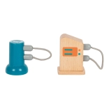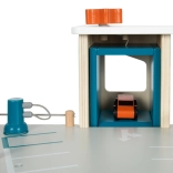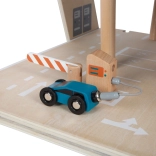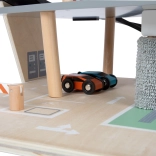 Súčasťou balenia sú dve autíčka a detailné doplnky: čerpacia a nabíjacia stanica, zdvíhacia rampa aj umývačka s textilnými kefami. Robustné spracovanie zo silnej drevenej preglejky s prvkami z masívneho dreva a bezpečného plastu zaručuje stabilitu a odolnosť. Výrobok vyžaduje montáž; balenie obsahuje obrázkový návod.