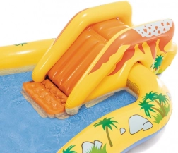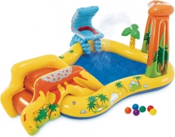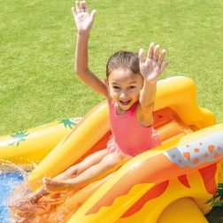 Premeňte horúce dni na dokonalú zábavu. Nafukovacie vodné ihrisko INTEX ponúka päť atrakcií v jednom: plytký bazénik na vyvádzanie, mäkkú šmykľavku s polstrovaným dojazdom, osviežujúcu fontánu a vodnú clonu napojené na hadicu a tiež zábavný vodný basketbal s farebnými loptičkami. Vďaka univerzálnym rozmerom sa hodí na záhradu, terasu aj na cesty na pláž.