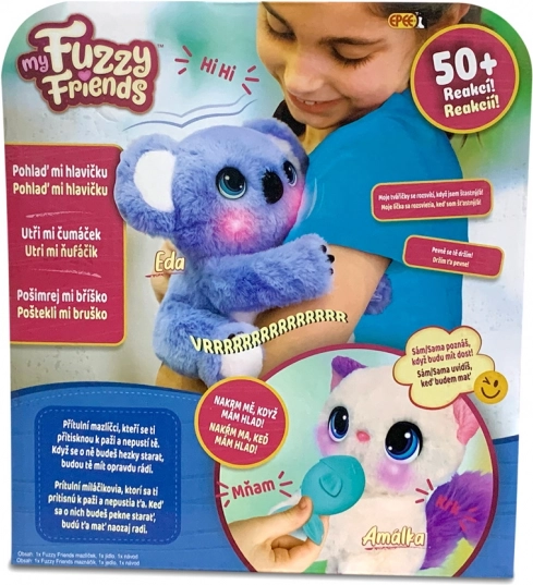 Objavte čaro interaktívneho plyšového zvieratka koaly Edu z radu My Fuzzy Friends. Tento maznavý priateľ reaguje na dotyk a interakciu viac než 50 rôznymi spôsobmi vrátane zvukov a pohybov. Eda má špeciálne kĺby, ktoré mu umožňujú objať detskú ruku a pritúliť sa k nej. Koalu môžete hladiť, štebliť, nakŕmiť, utrieť mu nos a dokonca mu pomôcť zaspať.