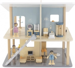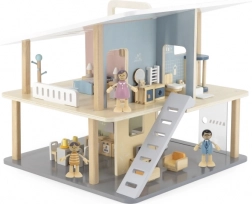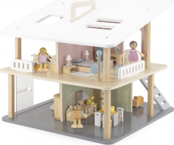 Štýlový drevený domček pre bábiky s dvoma poschodiami, piatimi izbami a terasou ponúka otvorený prístup pre jednoduchú hru, prenosné prevedenie s madlom a hodiny kreatívnej, imaginatívnej zábavy pre deti od 3 rokov.