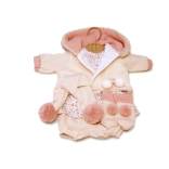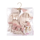 Štýlová 5-dielna súprava pre bábiku veľkosti 42 cm prináša všetko pre dokonalé prezliekanie. Nájdete v nej mäkučký pletený svetrík s kapucňou, kvetinový overal/šatočky, ponožky a rukavičky aj huňatý šál s brmbolcami a gumičky do vláskov. Kvalitné spracovanie, vyrobené v Španielsku, ideálne pre kreatívnu hru a rozvoj jemnej motoriky.
