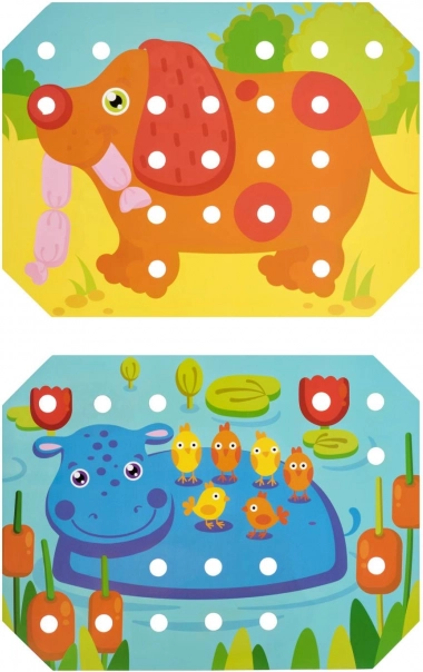 Deti si vyberú jednu z farebných predlôh, položia ju na drevený podstavec a obrázok vyplňujú kolíkmi pomocou pinzety alebo rúk. Môžu tiež trénovať šnurovanie a vyšívanie pomocou priložených šnúrok. Hra prirodzene podporuje sústredenie, logiku, trpezlivosť a presnosť.