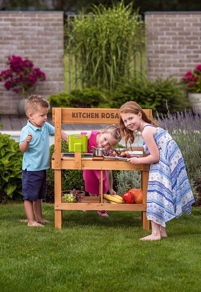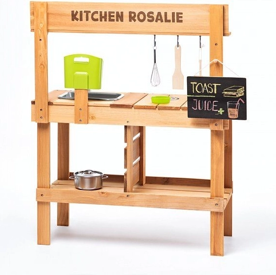 Drevená kuchynka Rosalie prináša deťom realistický priestor na hranie sa na varenie – od miešania a umývania v plastovom dreze až po servírovanie na pracovnej doske. Odolná kombinácia dreva a plastu je vhodná na vonkajšie použitie, zatiaľ čo háčiky a poličky udržia všetky riady a suroviny prehľadne po ruke.