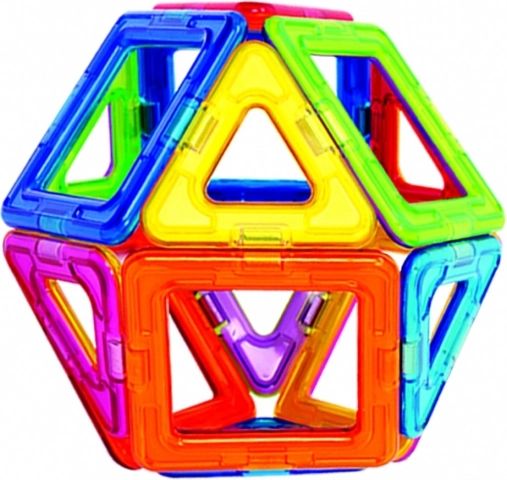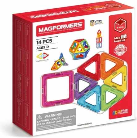 MAGFORMERS BASIC 14 sú bloky so zabudovanými silnými neodýmovými magnetmi, ktoré sa vždy navzájom priťahujú. Stačí priblížiť steny dvoch blokov k sebe a tie sa okamžite prepoja. Z kociek vytvorených podľa geometrických tvarov môžete stavať nádherné trojrozmerné stavby. Pri hre môžete použiť priložený návod alebo iné príklady na stránkach magformersworld.com, prípadne vlastnú fantáziu. Sada obsahuje: 8 trojuholníkov; 6 štvorcov.