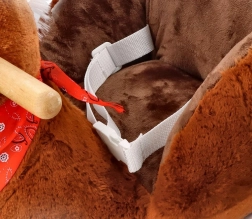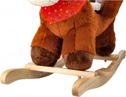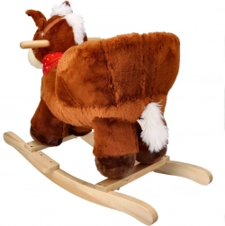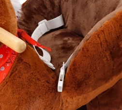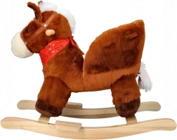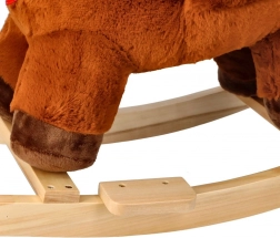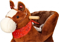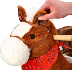 Hojdací koník je vybavený mäkkým hnedým telom, bielou hrivou a červenou šatkou, ktorá mu dodáva realistický a priateľský vzhľad.