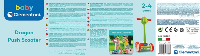 Prisrčen otroški skiro v obliki zmajčka znamke CLEMENTONI BABY podpira prve vožnje malih dirkačev. Ima robusten okvir, tri gumijasta kolesca za stabilnost in mehke gumijaste ročaje. Odlično se obnese v zaprtih prostorih in na prostem ter pomaga razvijati ravnotežje, koordinacijo in gibalne spretnosti.