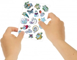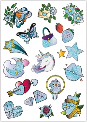 Komplet Crazy Chic bleščeče tetovaže vsebuje široko paleto dizajnov, vključno z enorožci, metulji in drugimi motivi. Tetovaže se enostavno nanašajo in so dermatološko testirane.