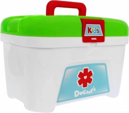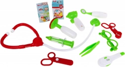 V kompletu je vse, kar mali zdravnik potrebuje: stetoskop, očala, dvoje škarij (tudi z zaobljeno konico), pinceta, brizga, termometer, škatlica z obliži in obkladki, pregledno ogledalce, pregledni nastavek, kladivce in nalepke. Igra pomaga premagovati strah pred zdravnikom, razvija socialne veščine in spodbuja domišljijo.