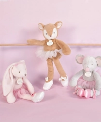 Ta zelo mehka plišasta miška je oblečena v baletni kostum s tilastim tutu krilcem in satenastimi balerinkami, okrašenimi z žametno pentljo. Otrokom ponuja mešanico nežnih in trendovskih barvnih harmonij, ki pritegnejo tako najmlajše kot večje otroke. Idealna je ne le za igro doma, temveč tudi za sprehode.