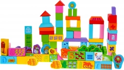 Ta bogat komplet lesenih kock otrokom prinaša ure smiselne zabave. Kocke so izdelane iz kakovostnega lesa, lakirane z varnimi barvami in imajo gladke, zaobljene robove brez ostrih delov za udobno in varno igro. Različne oblike in barve spodbujajo gradnjo hišk, stolpov, mostov in preprostih vozil.