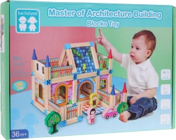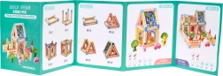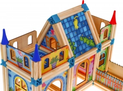 Kombinacija konstrukcijskih prizem in potiskanih delov otrokom omogoča ustvarjanje pisanih hišic, ograj, vrat in celotnega mestečka. Spodbuja domišljijo in potrpežljivost.