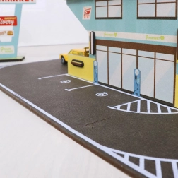 Supermarket z burger restavracijo, parkiriščem in prometno signalizacijo ustvari verodostojno sceno, ki otroke posrka v igro in razvija njihovo domišljijo.