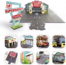 S tem ustvarjalnim kompletom zgradite supermarket z burger restavracijo, parkiriščem, uvozi in izvozi ter povezanimi cestami. Deli se preprosto spajajo, med igro trdno držijo in otrokom ponudijo ure domišljijske vožnje z avtomobilčki. Kartonske in lesene komponente iz odgovorno pridobljenih materialov zagotavljajo vzdržljivost in prijaznost do okolja.