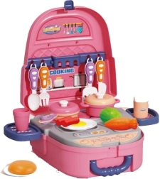 Kuhinjski set v praktični embalaži, zlahka ga zložiš in si ga daš na hrbet kot nahrbtnik. Set vsebuje 22 kosov kuhinjskih pripomočkov: pribor, lonce, pokrovke, imitacije hrane in drugo dodatno opremo. Podpira usklajen razvoj telesa in možganov, pomaga otroku pri učenju koordinacije oči, rok in možganov med igro.