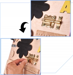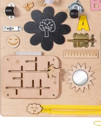 elektronska magnetna risalna tablica s pisalom, zobniki, zadrga, kolesarski zvonček, različni zapahi in kavlji, čevelj za vezanje, srajca z gumbi, lesene številke in črke, kolesce s številkami, labirint z morskim psom, tabla za kredo (oblika ladje), merilo, stikalo za luč, emotikon element, obešanka s ključki, vtičnica z vtičem, ježek (ježev trak), varno ogledalce v raketi, trak z zaponko