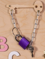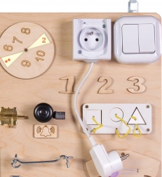 Stikalo za luč, vtičnica z vtičem, ključavnice in zapahi otroke učijo vzroka in posledice ter praktičnih veščin v varni obliki.