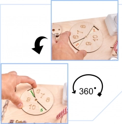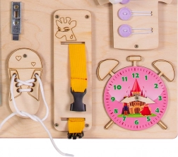 Vključuje pestro paleto aktivnosti: elektronska magnetna risalna tablica s pisalom, barvni zobniki, zadrga, kolesarski zvonček, različne vrste zapahov in kavljev, čevelj za vezanje, srajca z gumbi, lesene številke in črke, kolesce s številkami, labirint s premikajočim se morskim psom, tabla za kredo v obliki ladje, merilo, stikalo za luč, vtičnica z vtičem, ježek, varno ogledalce v raketi, ključavnica s ključki in trak z zaponko.
