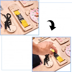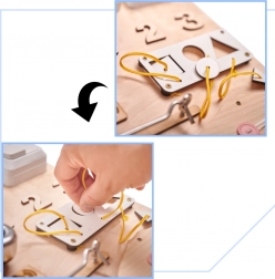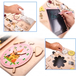 Odkrijte univerzalno leseno senzorično tablo velikosti 75 × 50 cm, ki združuje učenje skozi igro in razvoj fine motorike. Otroci lahko varno preizkusijo stikalo za luč, vtičnico z vtičem, ključavnice, zadrgo ter šniranje vezalk, hkrati pa urijo koncentracijo, koordinacijo oko–roka in logično mišljenje.