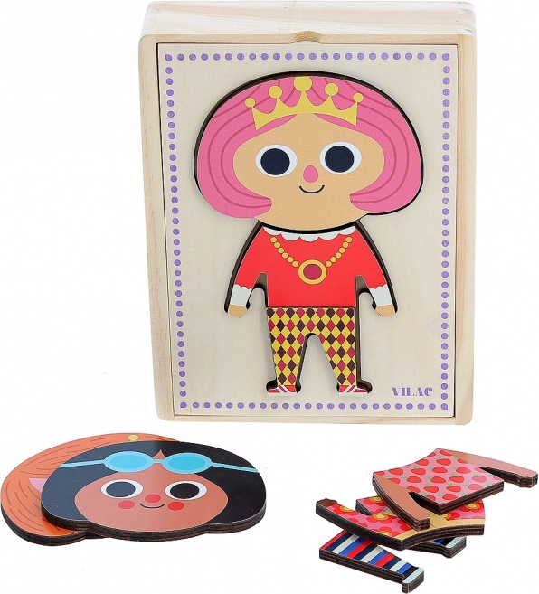 Lesena sestavljanka z oblačili ponuja otrokom možnost stilskega oblačenja figurice Jade. Z 6 različnimi kompleti lahko otroci kombinirajo obleke in razvijajo svojo domišljijo.