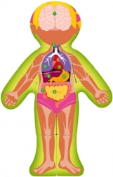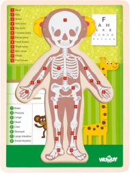 Kakovostne lesene puzzle razvijajo otrokovo domišljijo, fino motoriko in logično mišljenje. Otrok sestavlja dvanajst koščkov s podobo deklice, na njihovem hrbtni strani pa so označeni človeški organi. Podlaga prikazuje človeško okostje in vsebuje oštevilčen seznam organov in kosti – odličen uvod v spoznavanje anatomije v angleščini.